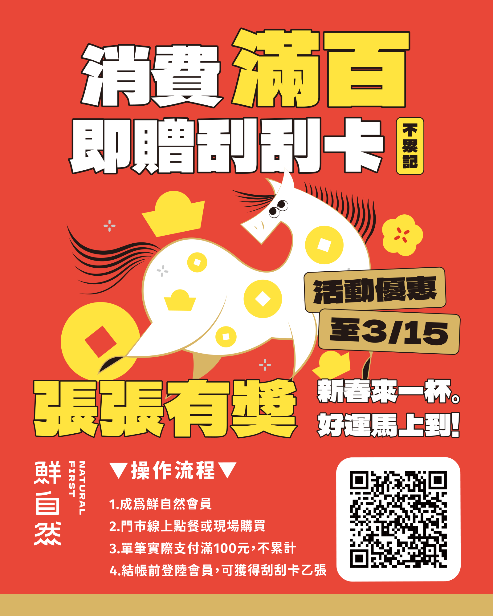 February 04.2026 檔期活動 新春來一杯,消費滿百好運馬上刮! ʜᴀᴘᴘʏ ʟᴜɴᴀʀ ɴᴇᴡ ʏᴇᴀʀ 2/4~3/15,單筆消費滿 $100(不累計) 系統自動送你 1 張刮刮卡,不用登記、不用加購,結帳就有! ▶張張有獎,驚喜不落空,刮刮卡內含多項飲品優惠與好康,喝一杯,也許下一杯就更划算。 記得先加入鮮自然會員喔!新春好運不用等,喝一杯,就從今天開始 #鮮自然 #消費滿百刮刮樂 #張張有獎 #新春好運馬上刮 #活動至315 返回列表